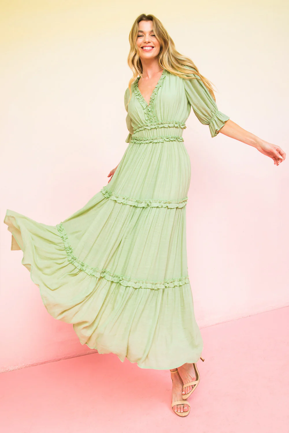 This MODERN MOVEMENT WOVEN MIDI DRESS is the perfect addition to your wardrobe. Crafted from solid woven fabric, it features a V neckline with delicate ruffled edge, short sleeve with ruffled cuff, elasticized waist and ruffled tiered skirt to give it a classic yet statement making silhouette. Get ready to dazzle in this timeless piece.