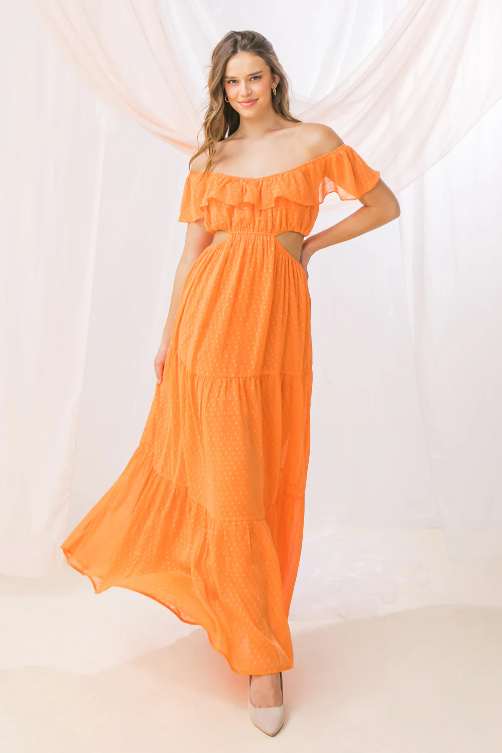 This READY TO FLOURISH WOVEN MAXI DRESS offers a chic, eye-catching look with its textured woven fabric, off-shoulder neckline with flounce, elasticized waist with side cut-out, and tiered skirt. Make a lasting statement at your next event and be ready to flourish!