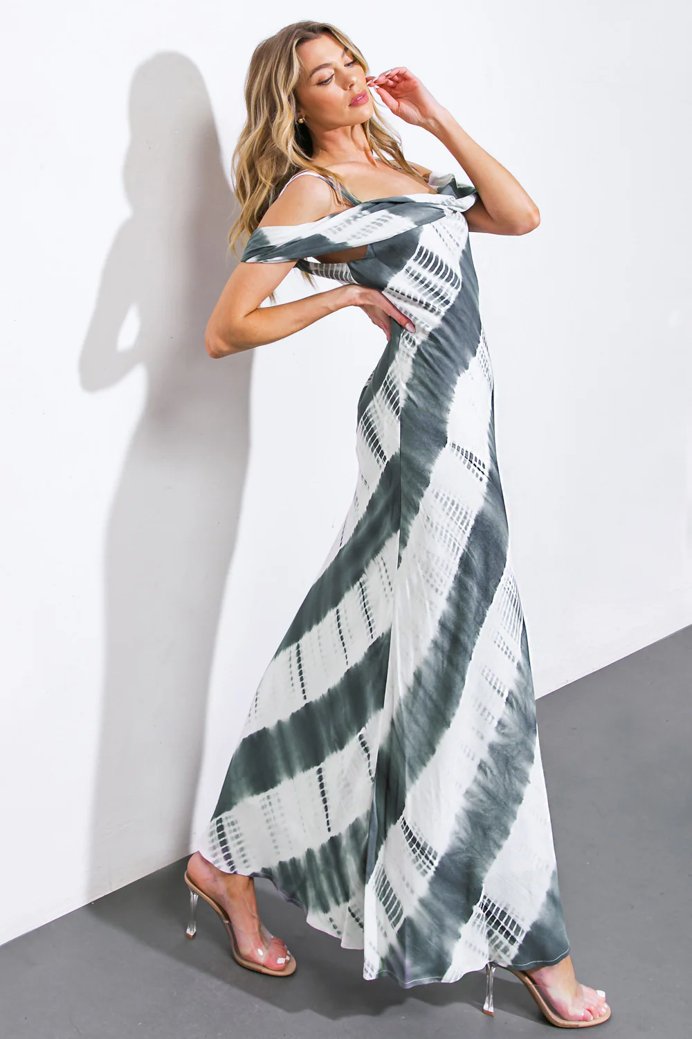 A printed woven maxi dress featuring cold shoulder and side zipper closure