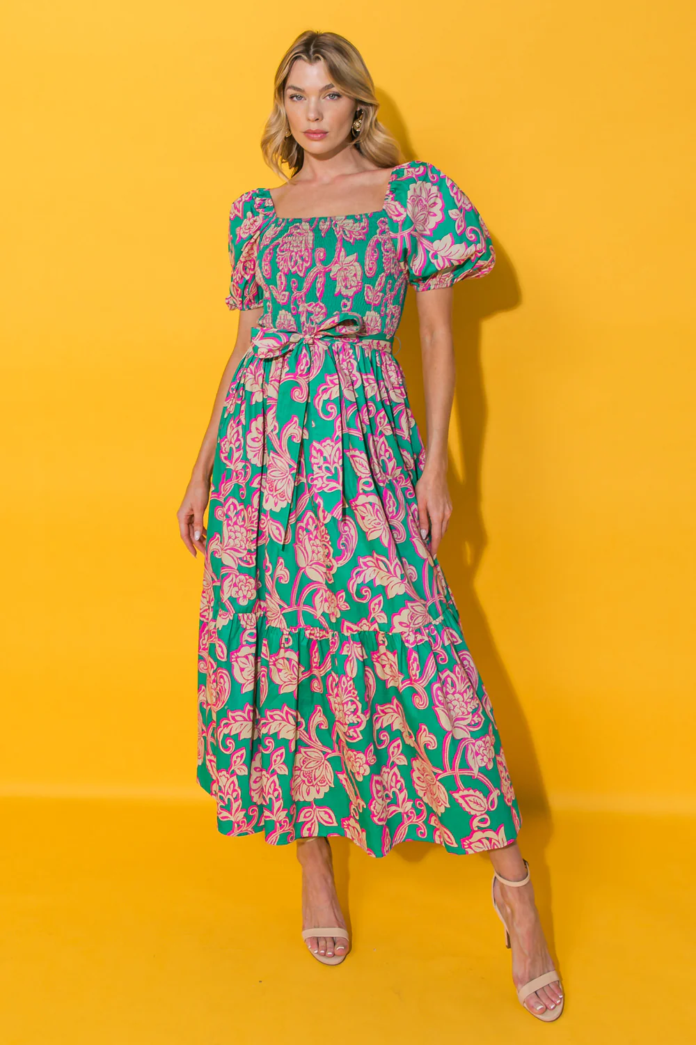 The RUN TOWARDS LOVE POPLIN ANKLE DRESS is a stylish and versatile option for any occasion. Made from durable poplin cotton, this timeless dress features a square neckline and short sleeves that provide a flattering and comfortable fit. The smocked bodice creates a flexible and comfortable fit, while the self sash tie cinches the waist for a stylish silhouette.