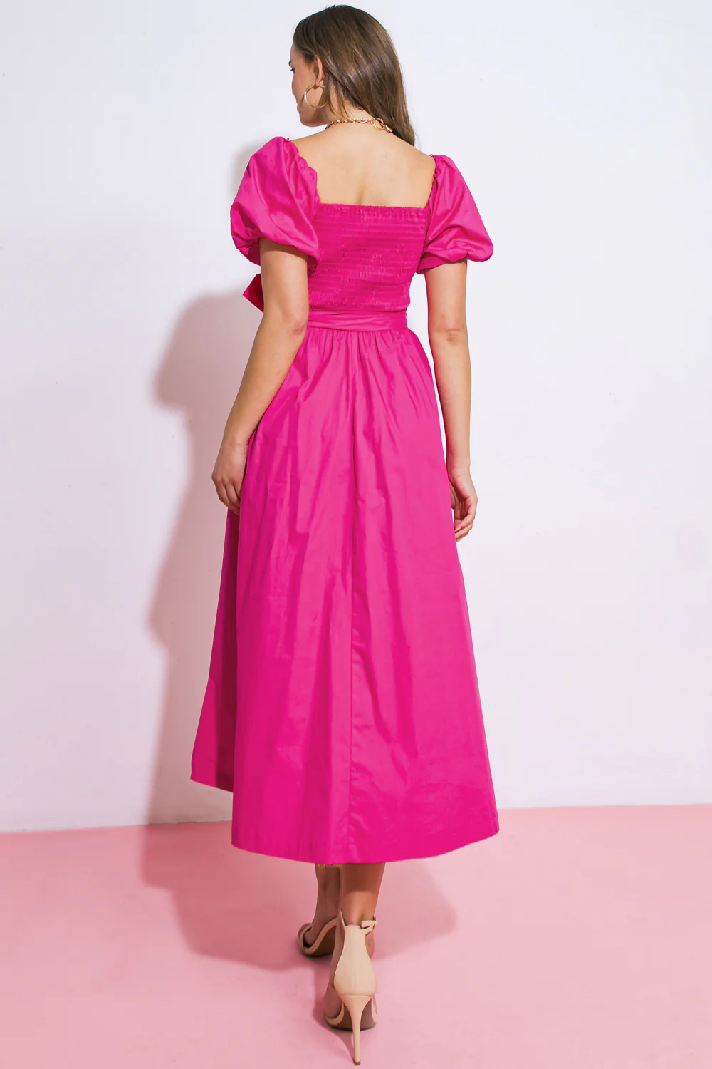 Indulge in the luxurious elegance of our solid woven midi dress, boasting an off-shoulder neckline, short puff sleeves, a smocked bodice, and a self sash tie.