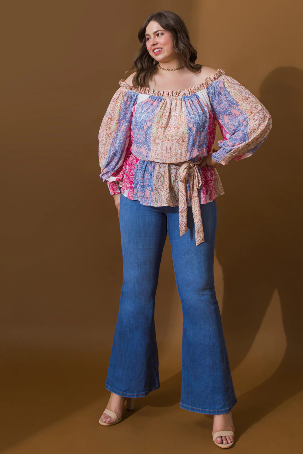 A printed woven off shoulder top featuring ruffled neck opening, sleeve with smocked cuff, and elasticized waist with self tie