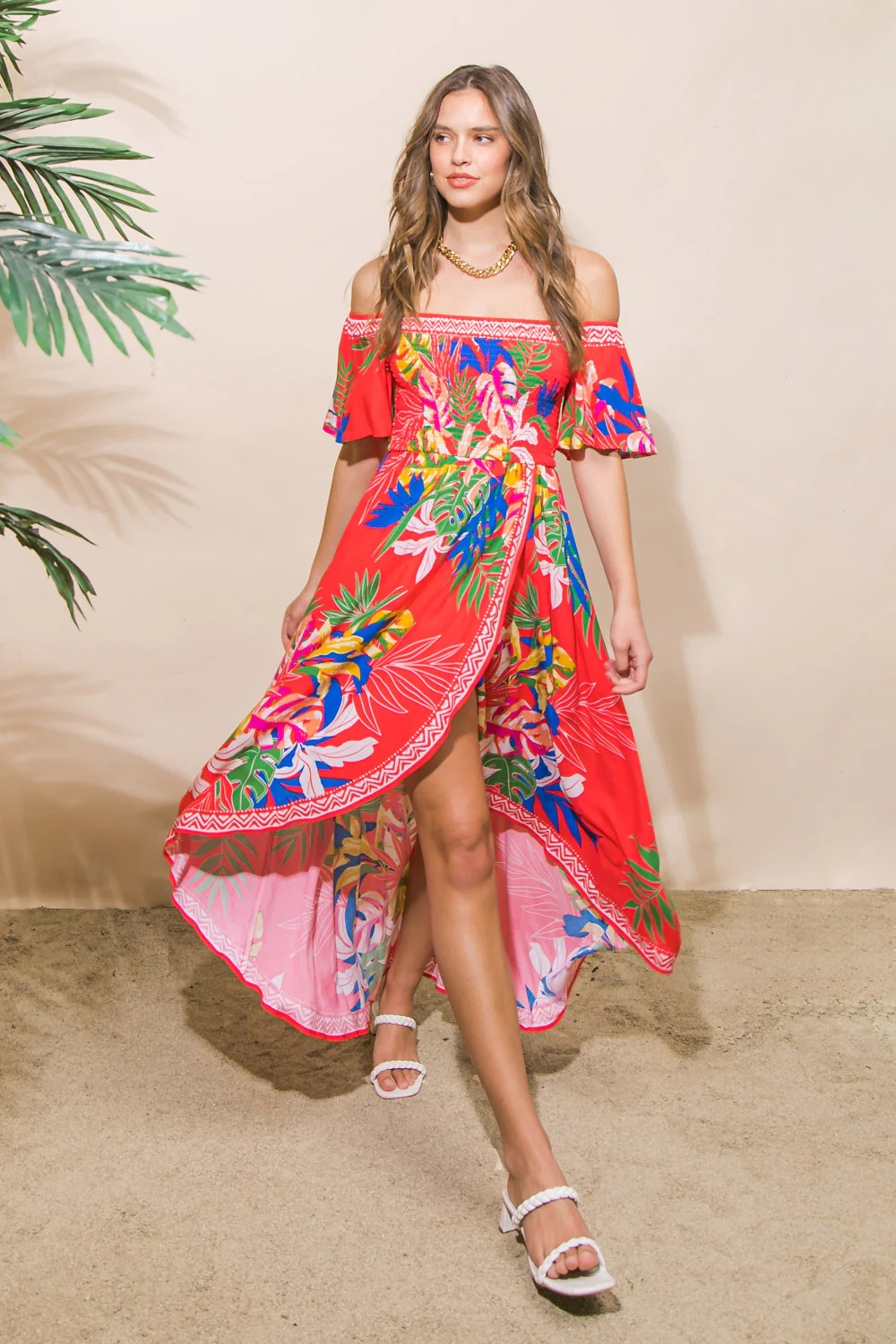 This COVER ME UP HI-LO DRESS is perfect for any season. Featuring a tropical midi-length, elasticized off-shoulder neckline with smocked bodice and short flutter sleeves, this dress will flatter any figure. The faux wrap skirt finishes the look with a playful, fun feel.
